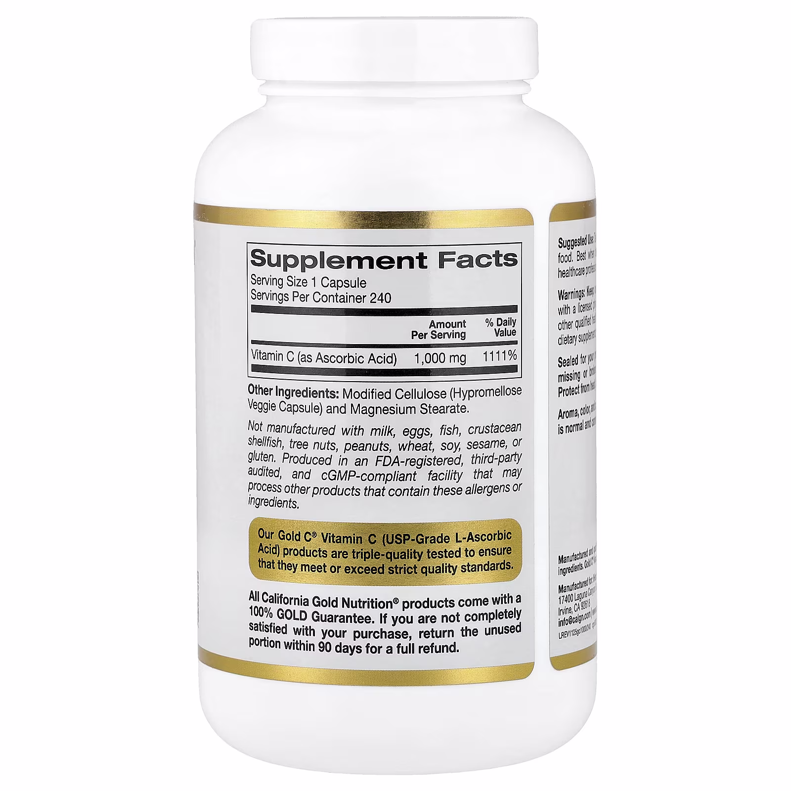 Gold C® de California Gold Nutrition contient de la vitamine C (sous forme d'acide ascorbique) de qualité USP dans des capsules végétales. Ce complément, qui convient aux végétariens, est formulé sans gluten, ni OGM, ni soja.