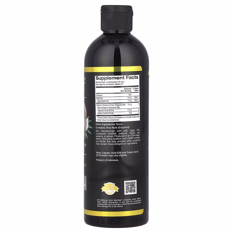 L'huile TCM biologique California Gold Nutrition SPORT contient des TCM issus de l'huile de noix de coco biologique (dont de l'acide caprylique et de l'acide caprique♦️) et rien d'autre : pas de gluten, d'OGM, d'huile de palme ni de soja.