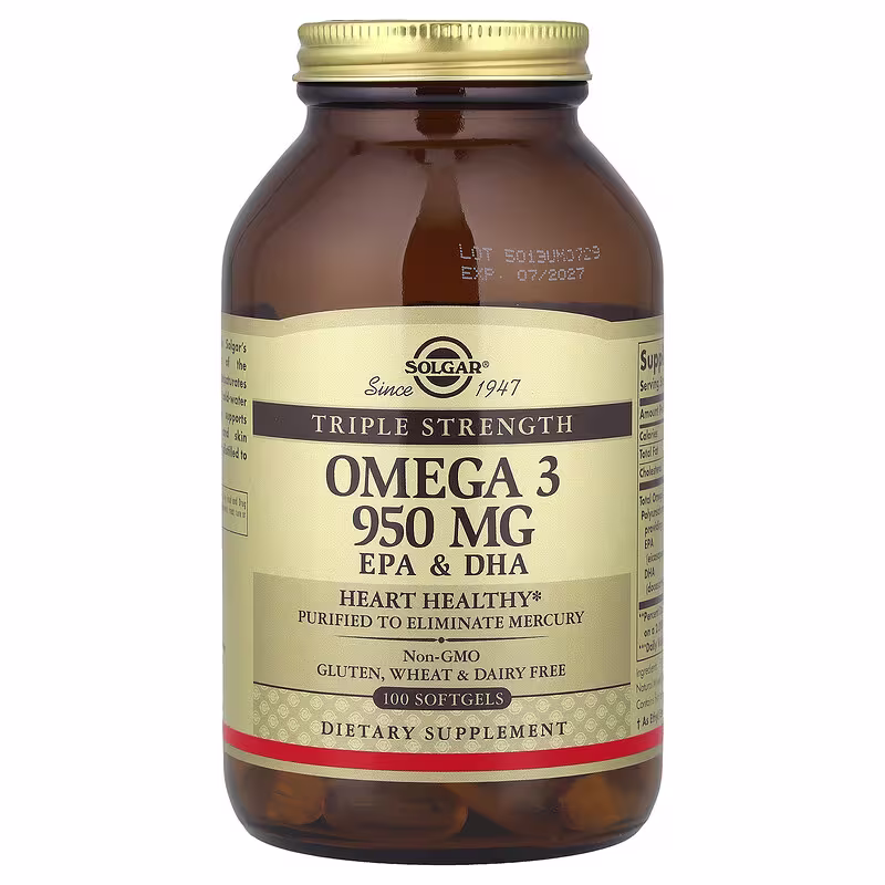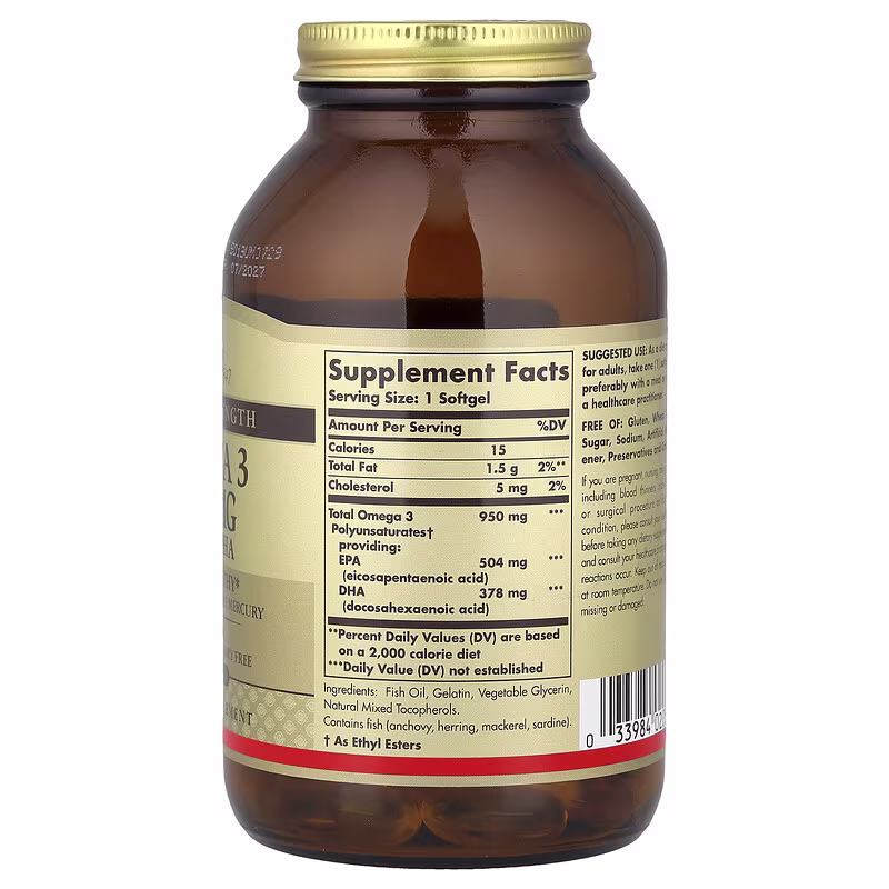 La formule d'oméga-3 à 950 mg constitue la concentration la plus élevée proposée par Solgar en oméga-3 polyinsaturés naturels (EPA et DHA) provenant de poissons d'eau froide. Cette formule soutient la santé cardiovasculaire, articulaire et cutanée. Elle est distillée moléculairement pour éliminer le mercure.